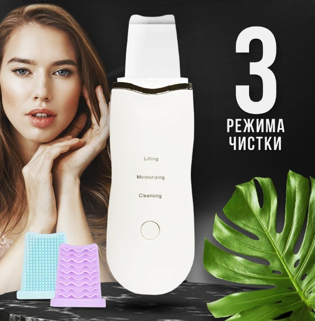Ультразвуковой аппарат для пилинга и лифтинга с функцией увлажнения Sonic Skin Scrubber (3 режима работы, две дополнительные насадки)-1 шт;