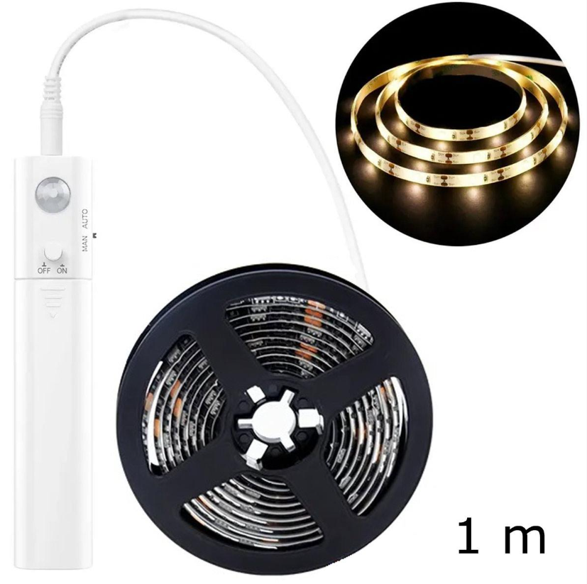 Светодиодная лента длиной 1 метр, светящаяся холодным белым цветом (5000K). В комплекте с модулем питания (от батареи). В комплект встроен датчик сумерек и движения (PIR). Физический переключатель позволяет отключить ленту навсегда. Два режима работы, адаптированные к потребностям пользователя (автоматический и ручной). Благодаря небольшим размерам лента отлично подойдет для освещения интерьеров шкафов и укромных уголков под и за мебелью.