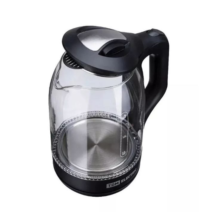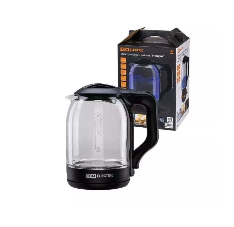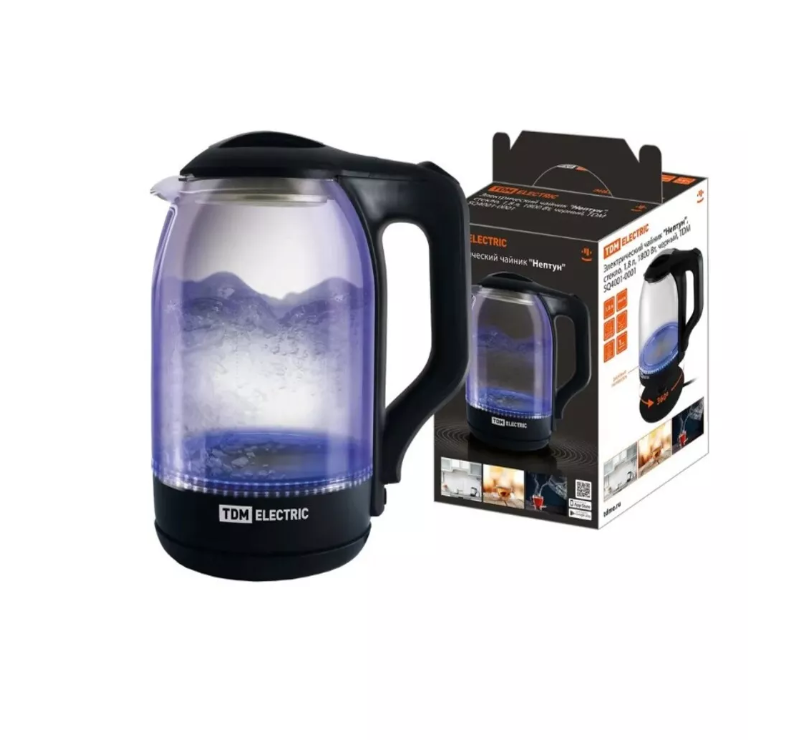 Продуманный во всех деталях симпатичный чайник станет незаменимым помощником на домашней кухне, офисе, и даже на профессиональной кухне. Дизайнерский чайник устанавливается на подставку, в которой находится закрытый надежный нагревательный элемент, который избавит от коррозии и накипи. Стоит также отметить, что база позволяет устанавливать красивый чайник в любом положении на 360 градусов. Также приспособление для регулировки длинного шнура 0,75 метра встроено в основание и позволяет очень легко укладывать провод внутрь. Основная часть корпуса состоит из закаленного стекла, что безопасно и прочно, а также это добавляет элегантности и позволяет полностью контролировать процесс нагрева и кипячения воды. Также, для большей эффектности предусмотрена нежная голубая синяя LED – подсветка, что позволяет использовать яркий чайник в тёмное время суток. Остальная часть корпуса выполнена из качественного пластика матового черного цвета, благодаря чему обладает повышенной износостойкостью и не имеет постороннего запаха. Эргономичная ручка сделают эксплуатацию устройства еще проще и комфортнее. Имеется удобный механизм открывания плотно прилегающей крышки, которую можно открыть на широкий угол, благодаря чему легко наполнять бесшумный чайник водой. Многоуровневая защита делает кухонный чайник безопасным даже для использования детьми: автоматическое отключение при закипании, функция индикации работы, шкала уровня воды, отключение прибора при недостаточном количестве воды или ее отсутствии. Это обеспечивает высокую степень безопасности и позволяет сэкономить электроэнергию, что является дополнительным удобством в его эксплуатации. Прозрачный электрочайник быстро и равномерно доводит до кипения большой объем воды 1,8 литра, это идеальная бытовая техника для большой семьи и компании. Тихий электрический чайник практически не шумит. Легкий чайник является отличным аксессуаром дома, а его классический дизайн позволит прибору вписаться любой в интерьер.