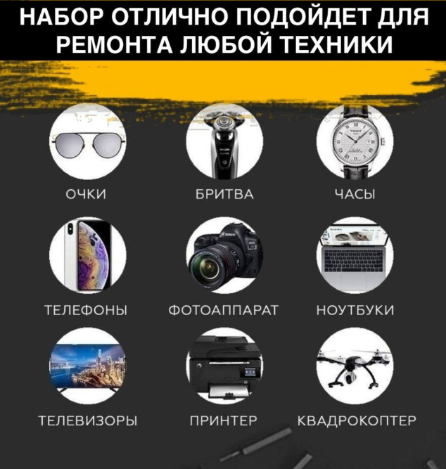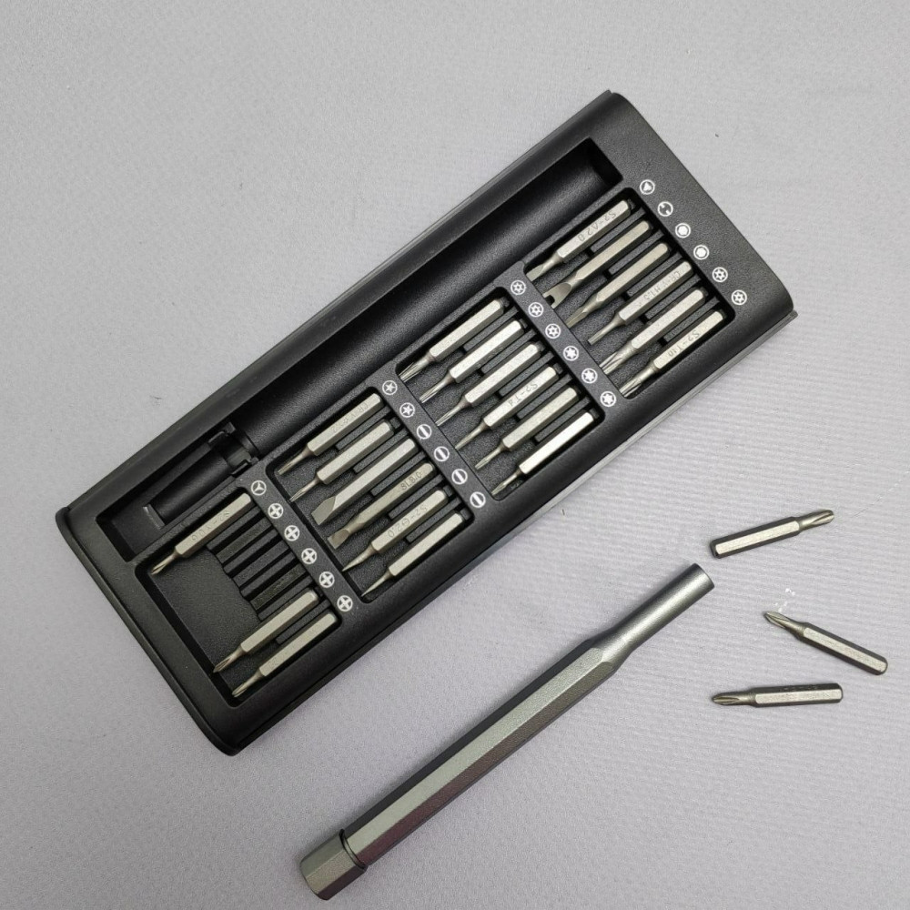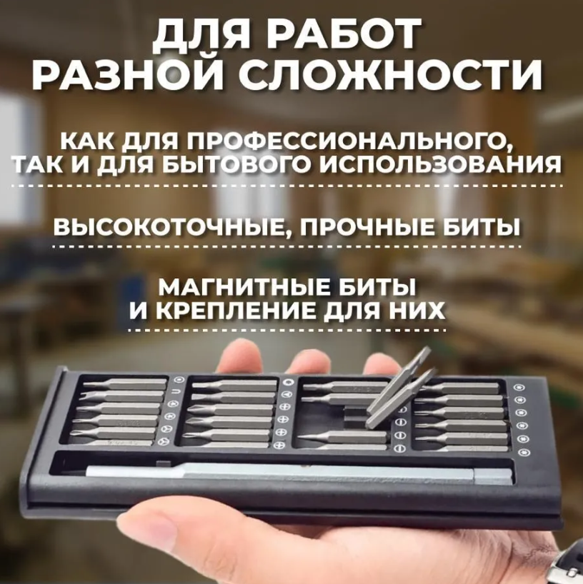 Набор отвёрток для телефона, компьютера, ноутбука и другой электроники - незаменимая вещь в современное цифровое время. Разобрать что-то мелкое обычными инструментами не всегда удается. Поэтому набор отверток для мелких работ сейчас пользуется большой популярностью. Он является не заменимой вещью в любом современном доме. В набор входят 24 насадки и сама отвертка. Вы сможете точно подобрать под любой болтик свою биту- не один предмет вашей раскрутки не останется без внимания!