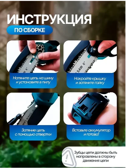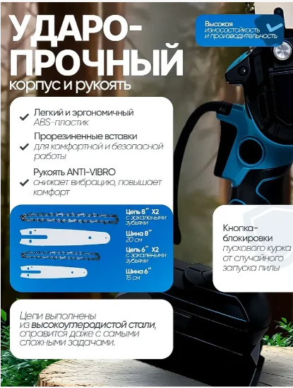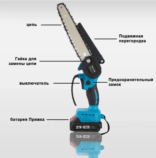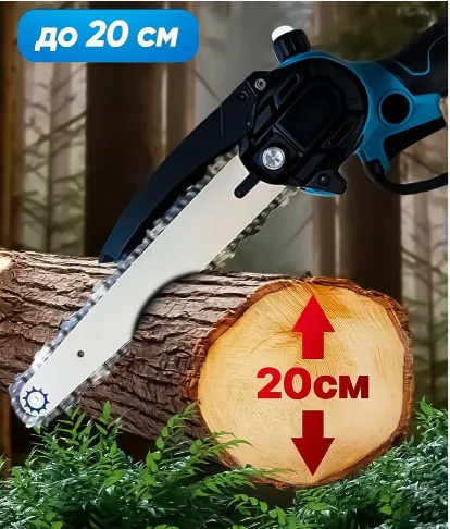 Электрическая аккумуляторная мини-пила с литиевым аккумулятором. Данная модель электропилы поможет Вам избавиться от старомодных инструментов и заменит: топор, ножовку и пилу. Идеально справляется с распиливанием небольших деревьев, дров, бруса. Качественный двигатель с медным сердечником высокой мощности, долговечная литиевая батарея с увеличенным напряжением 48V, отсутствие проводов делает пилу крайне удобной. Литиевая батарея решает проблему постоянного поиска источника питания. Дизайн разработан для легкого и удобного использования одной рукой. Небольшой вес делает данную модель крайне удобной. Однако несмотря на легкий вес, пила обладает мощным двигателем долгой службы, двигатель также защищен от перегрева, поскольку он автоматически отключается при превышении температуры. Простая регулировка натяжения цепи без необходимости разборки натяжение цепи можно легко отрегулировать с помощью винта, не разбирая саму пилу: у основания лезвия находится винт, затягивая который происходит натяжение лезвия.