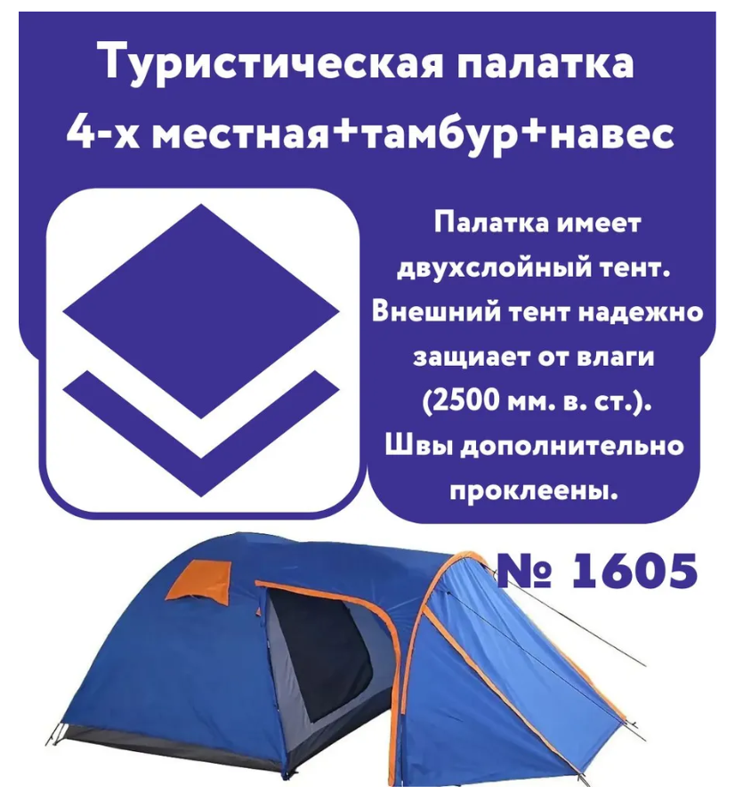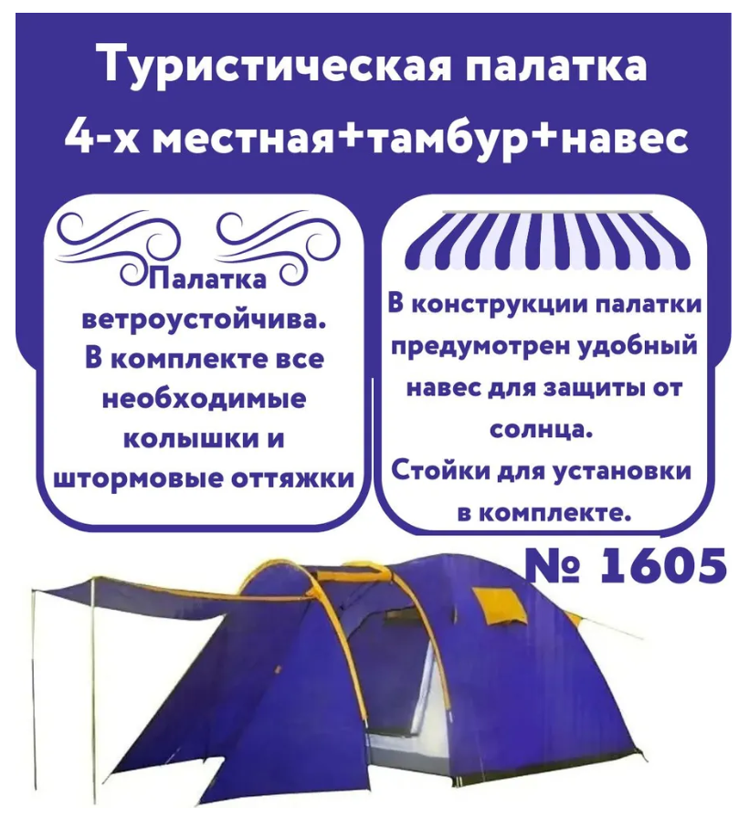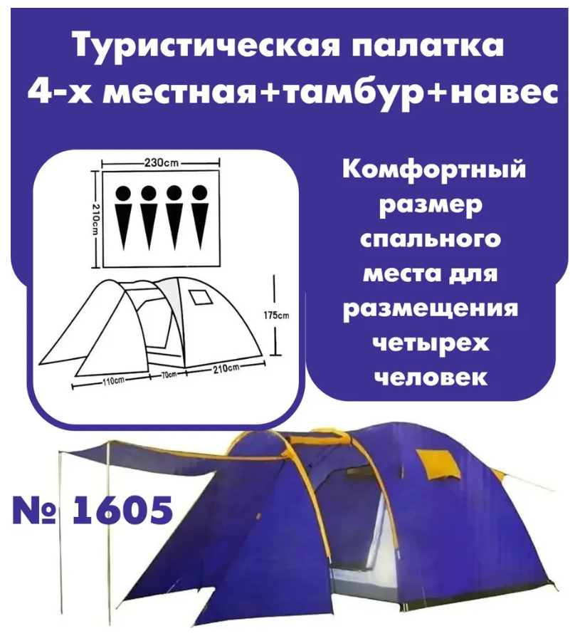 Палатка туристическая LanYu 1605 4-х местная 210+70+110+230х175 см – 1 шт.;