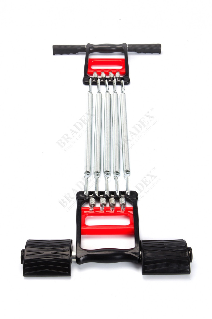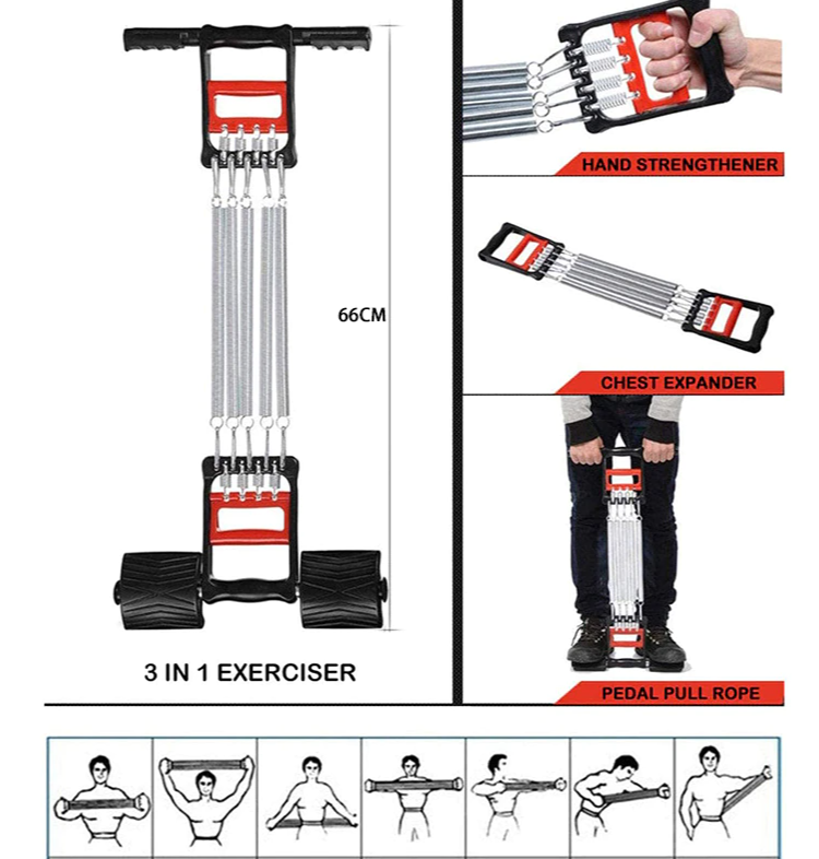 Нагрузку эспандера можно регулировать с помощью простого снятия и надевания пружин. Максимальная нагрузка – 30 кг, каждая пружина даёт нагрузку – 6 кг. Ручки выполнены из прочного пластика, не уступают в долговечности стальным пружинам. Попробуйте упражнения с эспандером, это позволит Вам поддерживать своё тело в хорошей форме всегда!Многофункциональный тренажер 3 в 1 с упорами для ног включает в себя эспандер: плечевой, грудной, для пресса и спины, и даже кистевой пружинный для укрепления мышц предплечий и увеличения силы хвата. Пружинный эспандер задействует практически все группы мышц, помогая спортсмену добиться великолепной физической формы. Двойные пластиковые рукоятки позволяют использовать экспандер как кистевой, а также тренажер для грудных и спины. Дополнительные ручки и педали способствуют тренировке пресса и ног. Подходит для фитнеса, гимнастики, пауэрлифтинга, кроссфита, разминок и других упражнений и силовых тренировок для шеи, груди и плечевого пояса, используется для укрепления диафрагмы и брюшного корда. Тип нагрузки – регулируемое сжатие и растяжение. Такой икспандер легко заменит упражнения с гантелями. Эспандер может выдерживать натяжение до 35 кг, что делает его отличным выбором для любого уровня физической подготовки. Вы можете постепенно увеличивать силовой тренинг, чтобы прогрессировать и достигать новых высот. Многофункциональный пружинный спортивный снаряд с захватом - это конструкция, в основу которой входят железные пружины, их добавляют по мере улучшения результатов, начиная, например, с 10 кг, 15 кг или 20 кг. Сопротивление металлического испандера можно регулировать с помощью простого снятия и надевания 5 съемных стальных пружин (каждая 6 кг максимальная мощность - 30 кг). При длине в 65 см, он дает растяжение до 150 см. Эргономичные рукоятки выполнены из прочного пластика. Экспандер дают возможность проводить эффективные занятия как в домашних условиях, так и в зале, фитнес-центрах. Данный товар предназначен как для новичков, так и для профессионалов, предпочитающих тренировки с умеренными нагрузками, как для мужчин, так и для женщин.