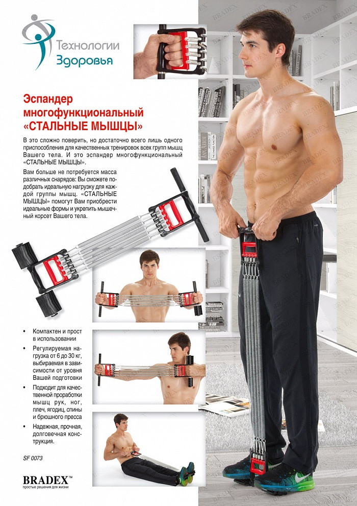 Эспандер многофункциональный «СТАЛЬНЫЕ МЫШЦЫ» с мощным сопротивлением эффективно укрепит мышцы груди, пресса, спины, рук, всего плечевого пояса и даже кистевые мышцы.